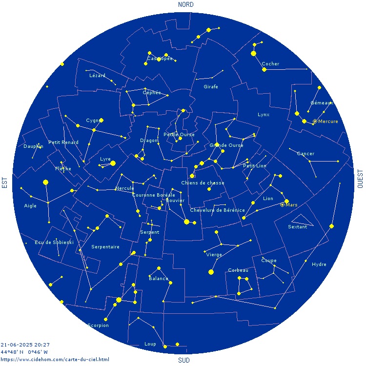 • Dans Stellarium ou SkyCharts, régler la latitude (47°N), la longitude (au centre de la France ≈ 2°E), et choisir une date/heure.