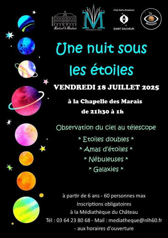 Pour la 3ème année consécutive, la Médiathèque du Château, en partenariat avec les clubs d'astronomie du Senlisien (Mars60) et de Saint-Sauveur (CAASV), organise sa nuit sous les étoiles.