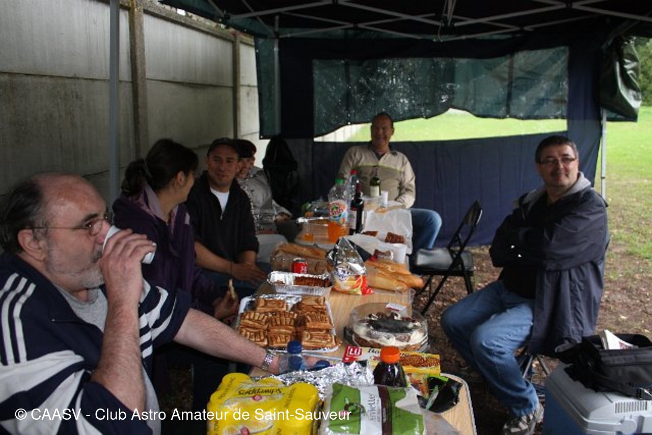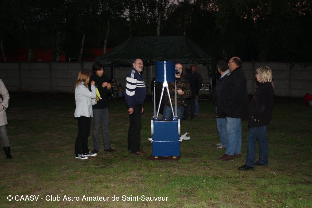 Le CAASV a organisé sa 4ème Nuit des Étoiles sous le mauvais temps et la pluie ! Mais cela n’a pas démotivé nos membres pour concocter une Nuit des Étoiles de qualité à notre public. En effet, grâce au barnum acquis avec l’aide de la mairie de Saint Sauveur, nous avons accueilli environ 20 visiteurs, et le tout, à l’abri de la pluie qui est resté tenace jusqu’à 23 h. Durant cette première partie de nuit, les membres et le public ont abordé l’Astronomie Amateur par le biais du matériel exposé, d’atlas du ciel mais aussi par les travaux des membres (dessins astronomiques…)… après tout attente, le ciel c’est complètement dégagé à partir de 0h30 et ce jusqu’à 4 h du matin ! Ni une ni deux, les membres ont immédiatement sorti leurs instruments afin de permettre aux visiteurs restés avec nous d’observer les beautés du ciel. Le public a pu alors observer des galaxies (M81-82, M31, M32, M110, M63, NGC7331 …), des amas d’étoiles (M13, M15, M3, double amas de Persée, M11…), des nébuleuses (Dentelles du Cygne…), des étoiles double (Shedir, Albireo …) et en fin de soirée Jupiter et ses satellites. Le public était comblé. Le bilan de cette Nuit des Étoiles reste très positif. Et comme toujours je remercie les membres du CAASV pour leur savoir faire, leur sérieux et leur bonne humeur. De plus, je remercie la municipalité de Saint Sauveur pour son soutien, son implication dans nos projets et pour nous avoir permis d’acquérir un barnum sans lequel cette prestation aurait été un fiasco. Merci à tous !