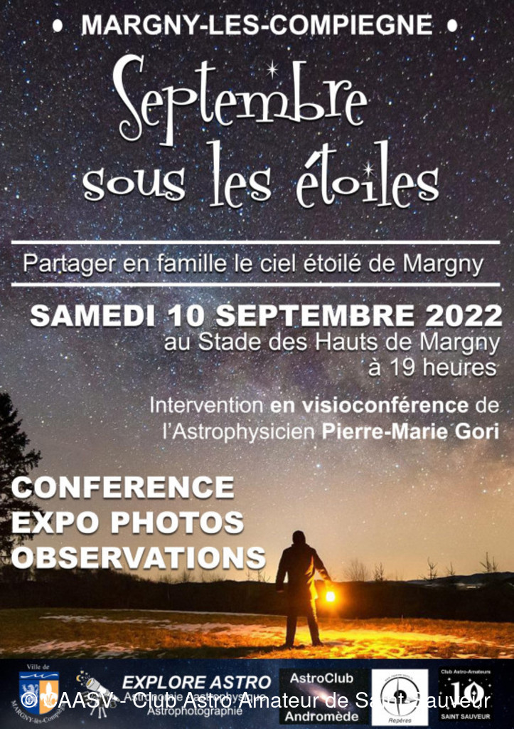 Le 10 septembre 2022, le CAASV était présent à Margny-les-Compiègne pour la soirée "Septembre sous les étoiles". Le public était nombreux et enthousiaste pour écouter les nombreuses conférences et pour mettre l'œil à l'oculaire de nos différents télescopes installés ce soir là.