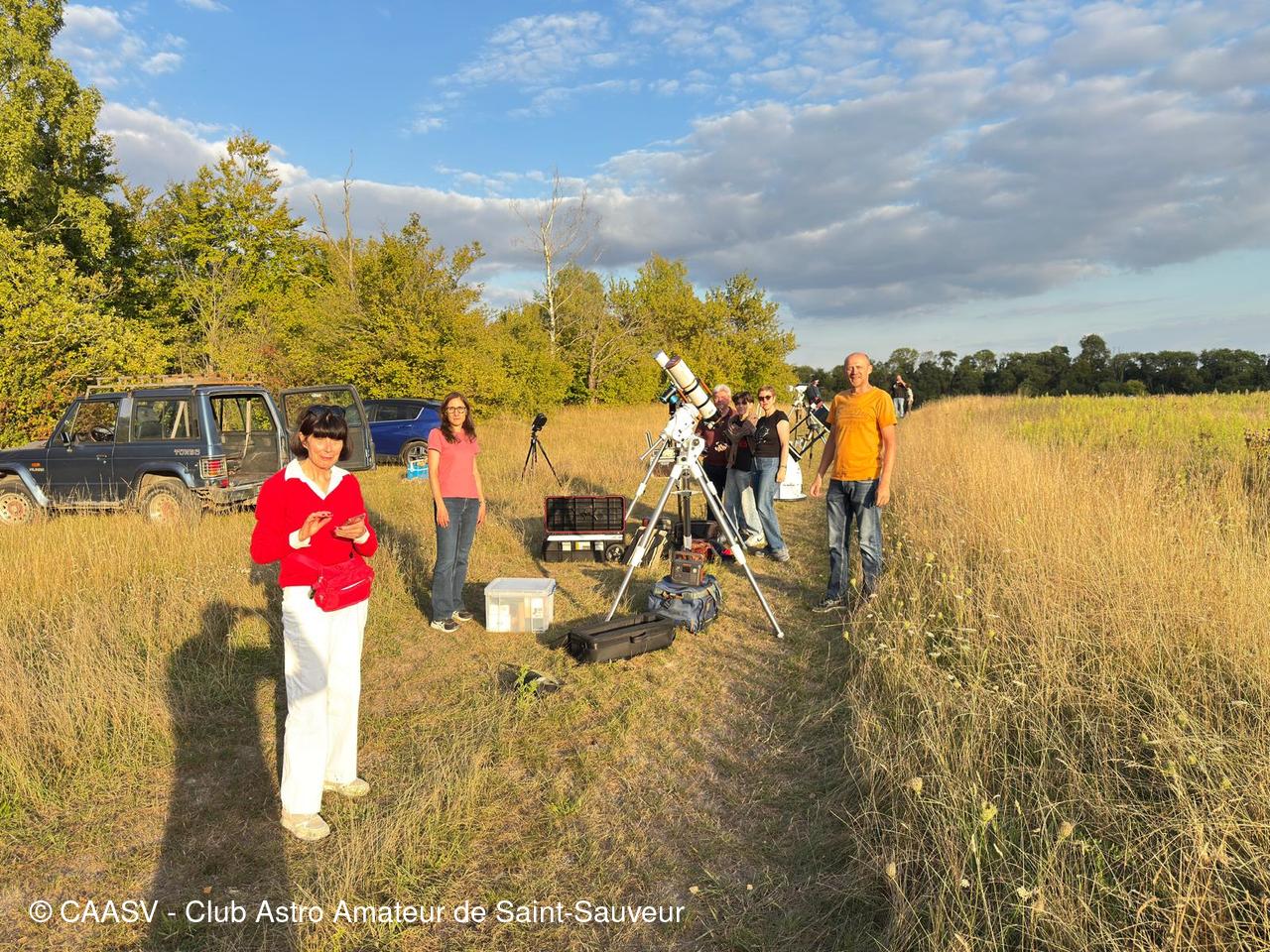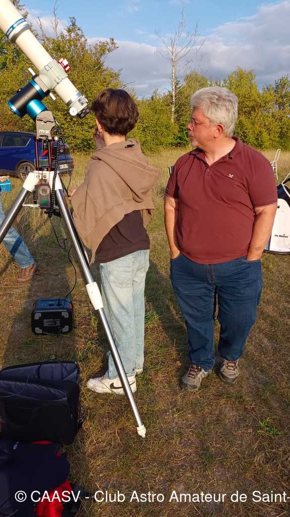 Nous étions neuf personnes pour représenter le CAASV. Françoise était présente avec son télescope. David, accompagné de son fils Noa, avait apporté son Dobson et le SeeStar S50 du club. Jérôme nous a présenté sa charmante épouse Muriel. Bien sûr, Axel et Aurore étaient de la partie et étaient non seulement équipés d'une belle lunette Takahashi mais aussi d'un beau Magnum de Champagne pour fêter les 15 ans de Raphaël, présent également. Enfin, " the last but not the least", votre serviteur.